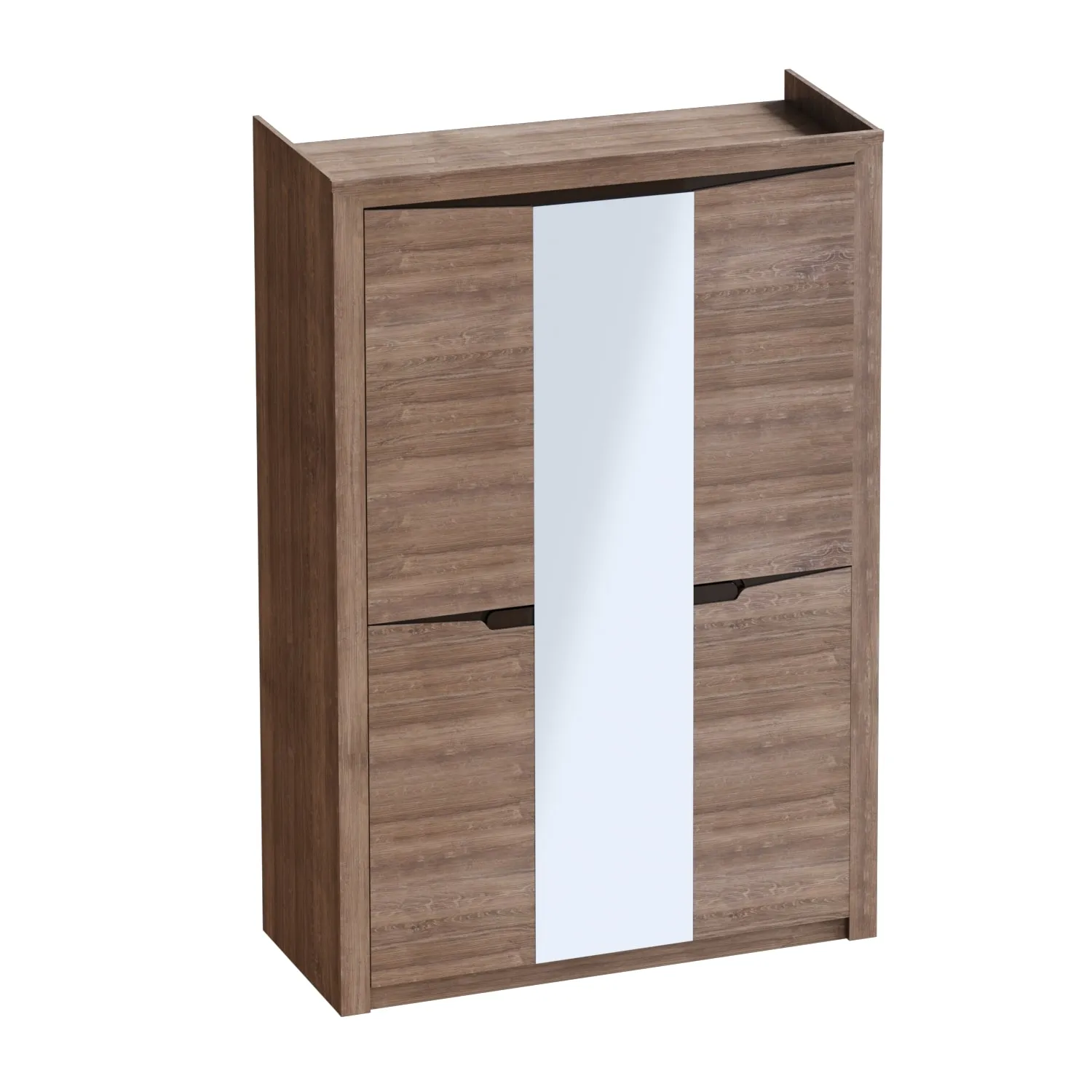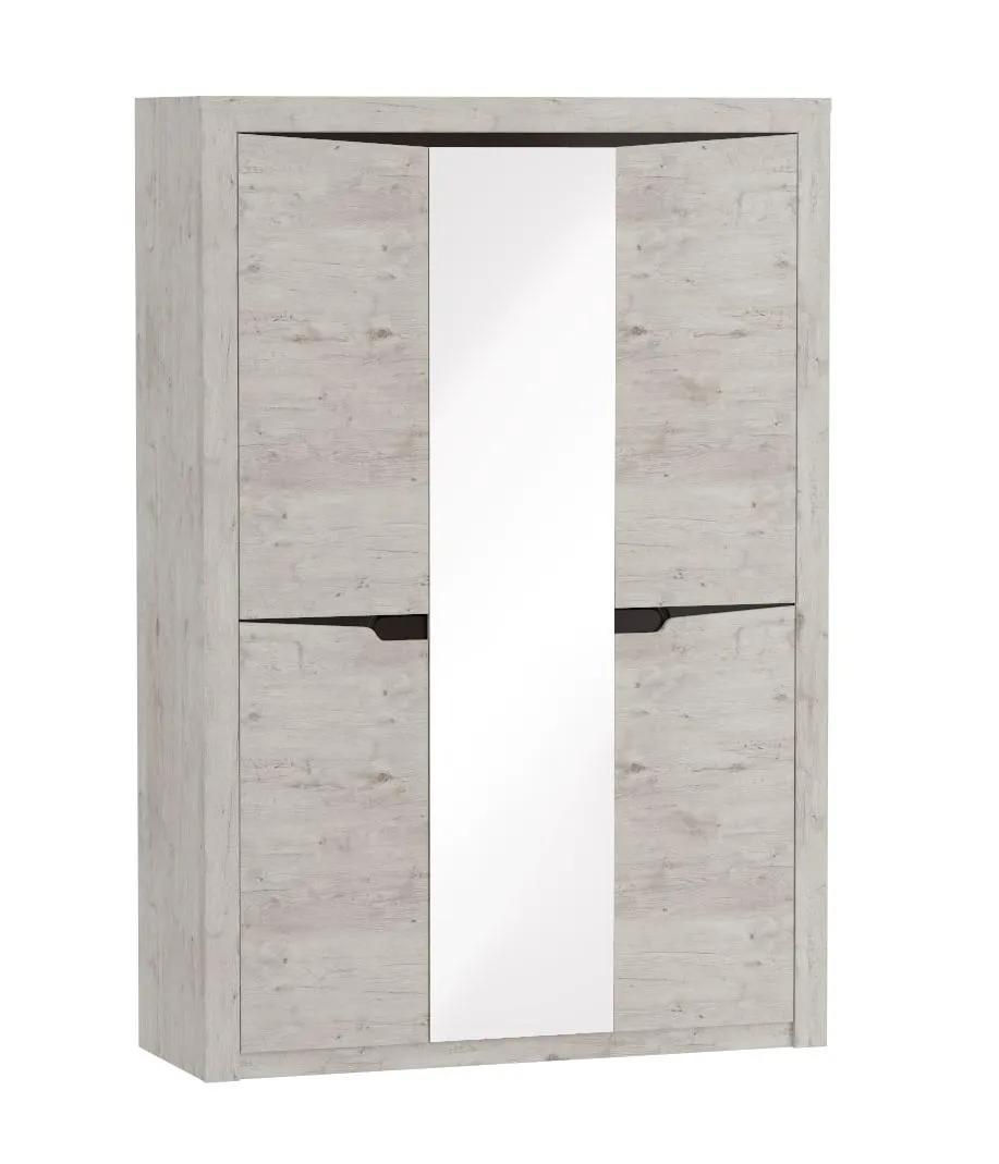 Трехдверный шкаф "Соренто" с зеркалом отлично подойдёт для спальни или прихожей и станет прекрасным дополнением к вашему интерьеру. На боковых дверях имеются декоративные вырезы, выполняющие функцию ручек. Внутреннее пространство шкафа разделено стенкой на два отделения: с полками и продольной стальной штангой, над которой размещается щитовая полка.