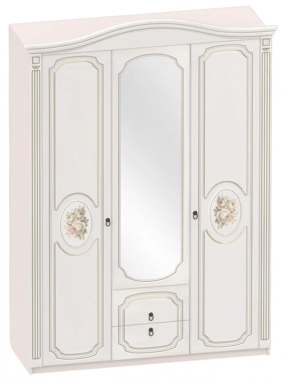 Фасады мебели декорированы элегантной фрезеровкой с эффектом патины и медальоном, на котором изображены розы. Для удобства использования дверцы и ящики оснащены темными металлическими ручками, имитирующими ковку.