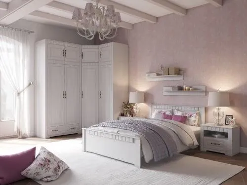 В серию "Прованс" входят: шкаф угловой, шкаф однодверный платяной, шкаф двухдверный, комод, антресоль двухдверная, антресоль угловая, антресоль однодверная, зеркало, стол туалетный, кровать, тумба прикроватная.