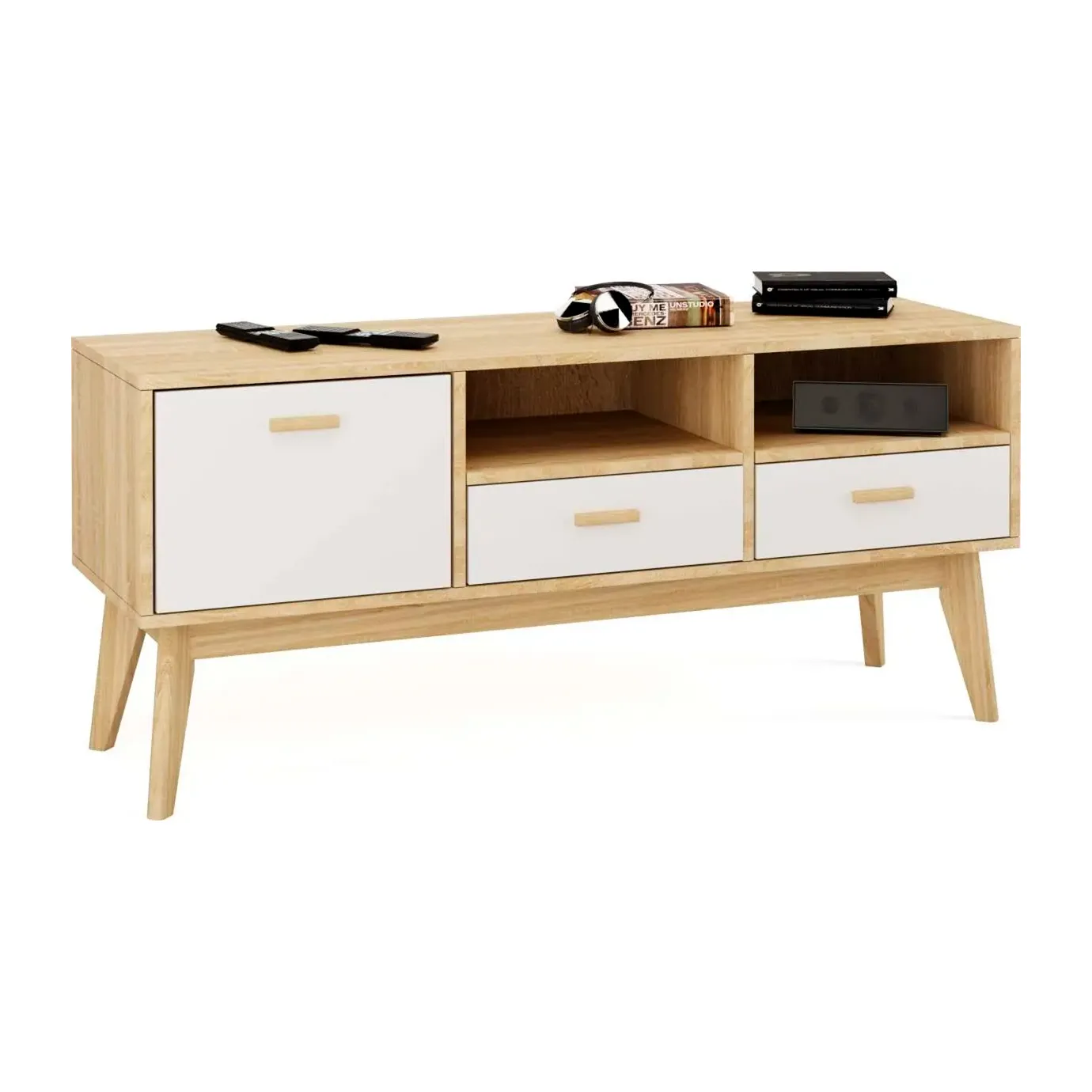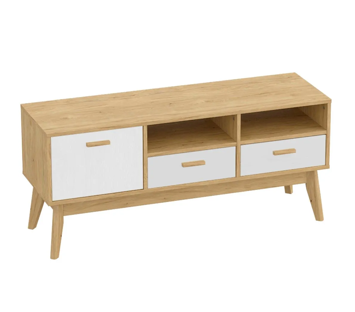 Упорядочить хранение сопутствующих аксессуаров и компонентов домашнего кинотеатра помогут выдвижные ящики с фасадами из белоснежного МДФ, секция с распашной дверцей и открытые ниши. Корпус изделия выполнен из ЛДСП, высокие стильные опоры и ручки - из массива березы.