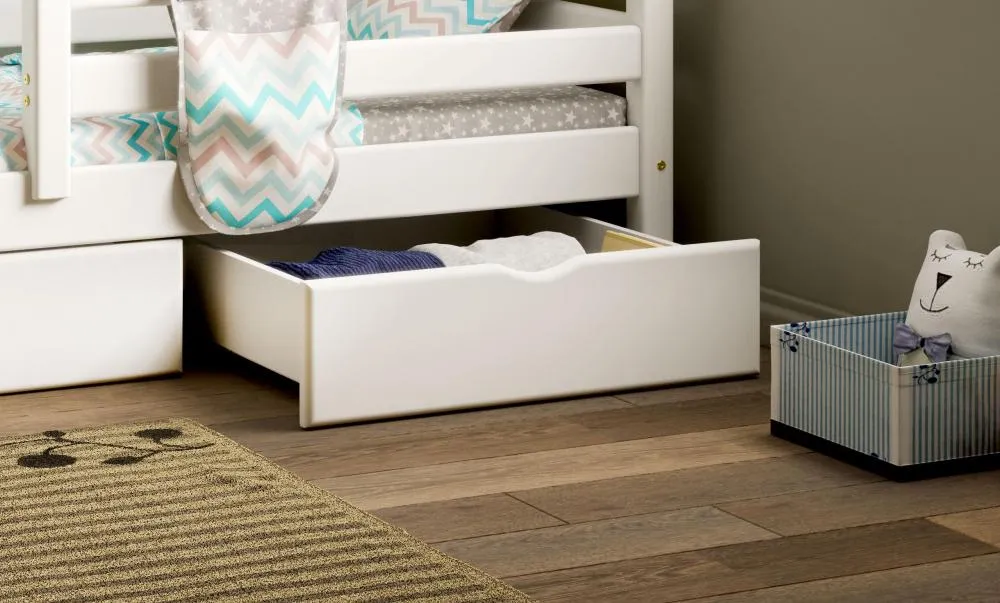 С помощью выкатного ящика Соня можно расширить функционал детской кровати и с максимальной пользой задействовать пространство комнаты. В модуле, оснащенном роликами, удобно хранить запасное покрывало или подушку.